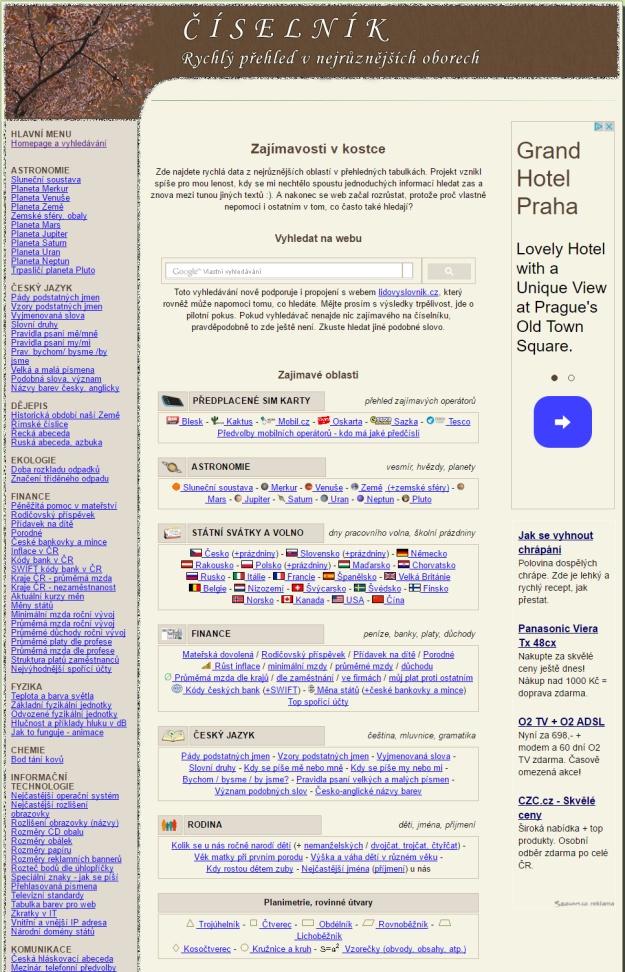 Zde najdete rychlá data z nejrůznějších oblastí v přehledných tabulkách. Projekt vznikl spíše pro mou (autor webu) lenost, kdy se mi nechtělo spoustu jednoduchých informací hledat zas a znova mezi tunou jiných textů :). A nakonec se web začal rozrůstat, protože proč vlastně nepomoci i ostatním v tom, co často také hledají?