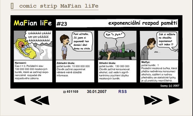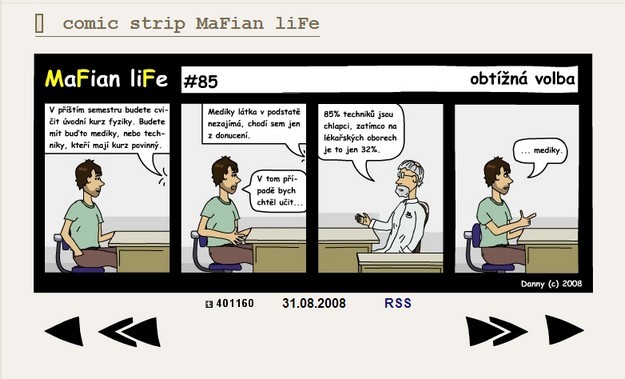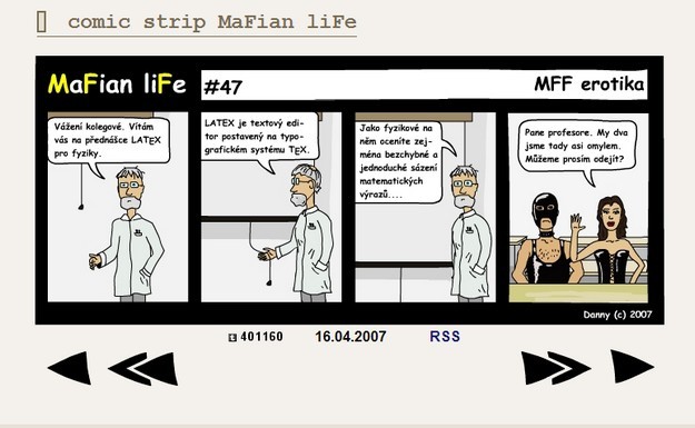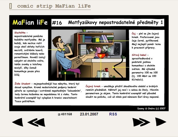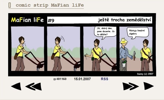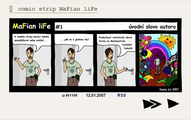 Comic strip MaFian liFe aneb realistický obraz života na Matematicko-fyzikální fakultě vznikal 2 roky a je tvořen 89 čtyřdílnými obrázky od #1 - úvodní slovo autora (12.1.2007) po #89 - pracné nic (14.1.2009).